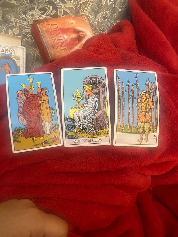 The three of cups shows what is possible, the nine shows what is here and I see the queen in the middle holding a holy container full of secrets. Queens show us how to integrate and embody. How not to numb out. Personally, she is my Mary card, not a plastic submissive Mary but the Mary of the Magnificat. What is she willing into existence as she holds what is precious in her hands. And how can we serve Her.